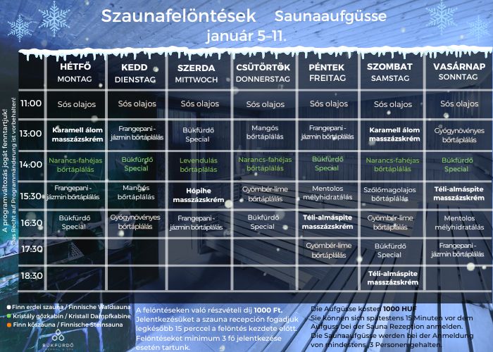 Účastnický poplatek na saunových ceremoniích je 1 000 HUF. Přihlásit se můžete na recepci sauny nejpozději 15 minut před začátkem seance. Saunové seance se konají při minimálním počtu 3 zájemců.
