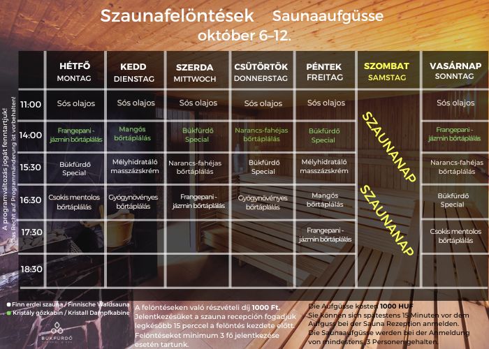 Die Teilnahmegebühr für Saunazeremonien beträgt 1 000 HUF. Sie können sich bis spätestens 15 Minuten vor Beginn der Zeremonie an der Rezeption der Sauna anmelden. Der Saunaaufguss findet bei einer Mindestteilnehmerzahl von 3 Personen statt.