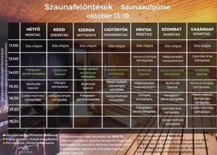 The participation fee for sauna ceremonies is 1 000 HUF. You can sign up at the sauna reception desk at least 15 minutes before the start of the infusion. The sauna ceremony takes place if there is a minimum of 3 participants.